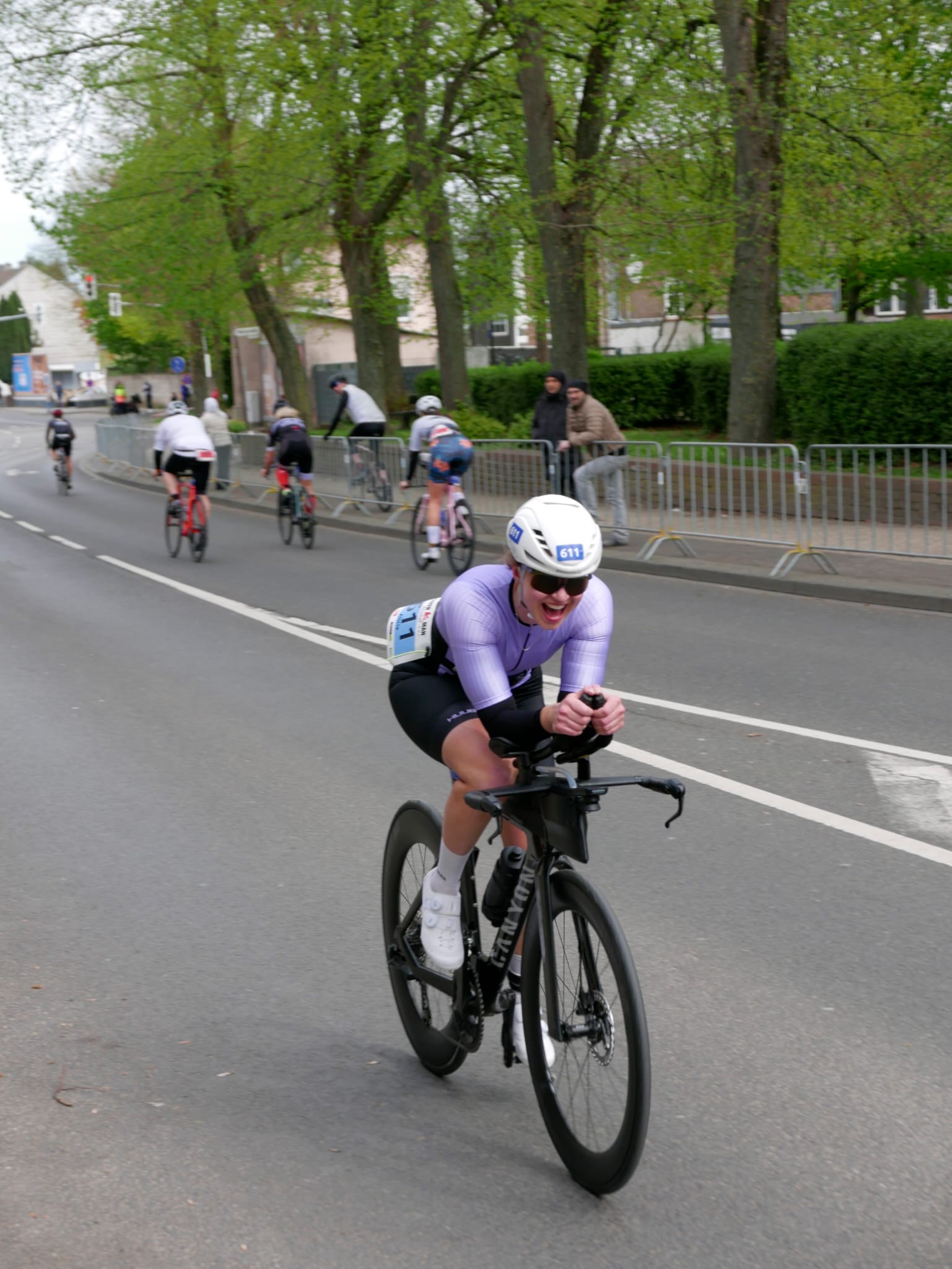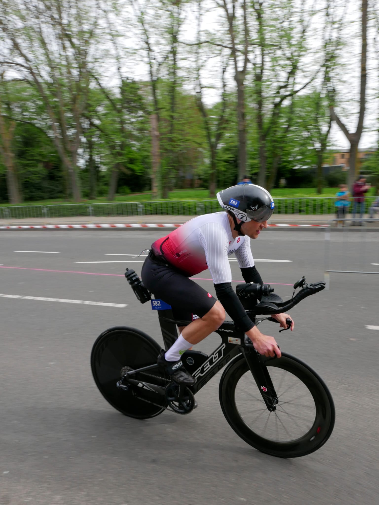 Nach dem ersten Lauf durch die Alsdorfer Innenstadt – eine flache Laufstrecke à 2,5 km, die viermal zu absolvieren war – ging es direkt in die Wechselzone aufs Rad. Die Radstrecke auf den für den Verkehr gesperrten Landstraßen rund um Alsdorf musste dreimal durchfahren werden. Die flache bis wellige Strecke ist gut geeignet für ein hohes Tempo. Doch man darf sie nicht unterschätzen. Im April kann es noch sehr kühl sein und der Kurs über die offenen Felder macht die Strecke sehr windanfällig. Zudem müssen pro Runde vier 180-Grad-Kehren durchfahren werden. Bei nur wenigen Grad über Null und heftigen Windböen war es auch in diesem Jahr eine durchaus herausfordernde und kühle Angelegenheit.