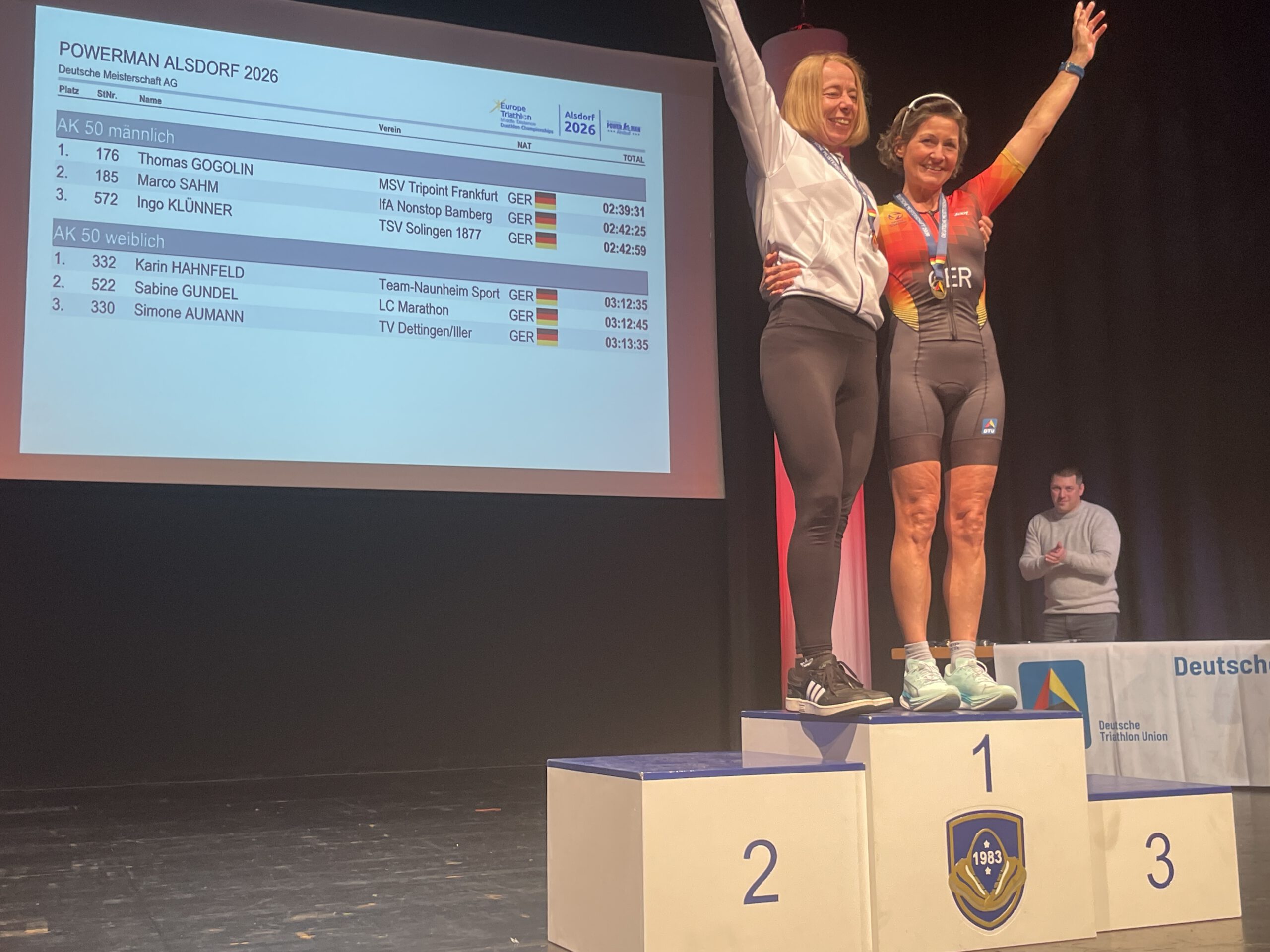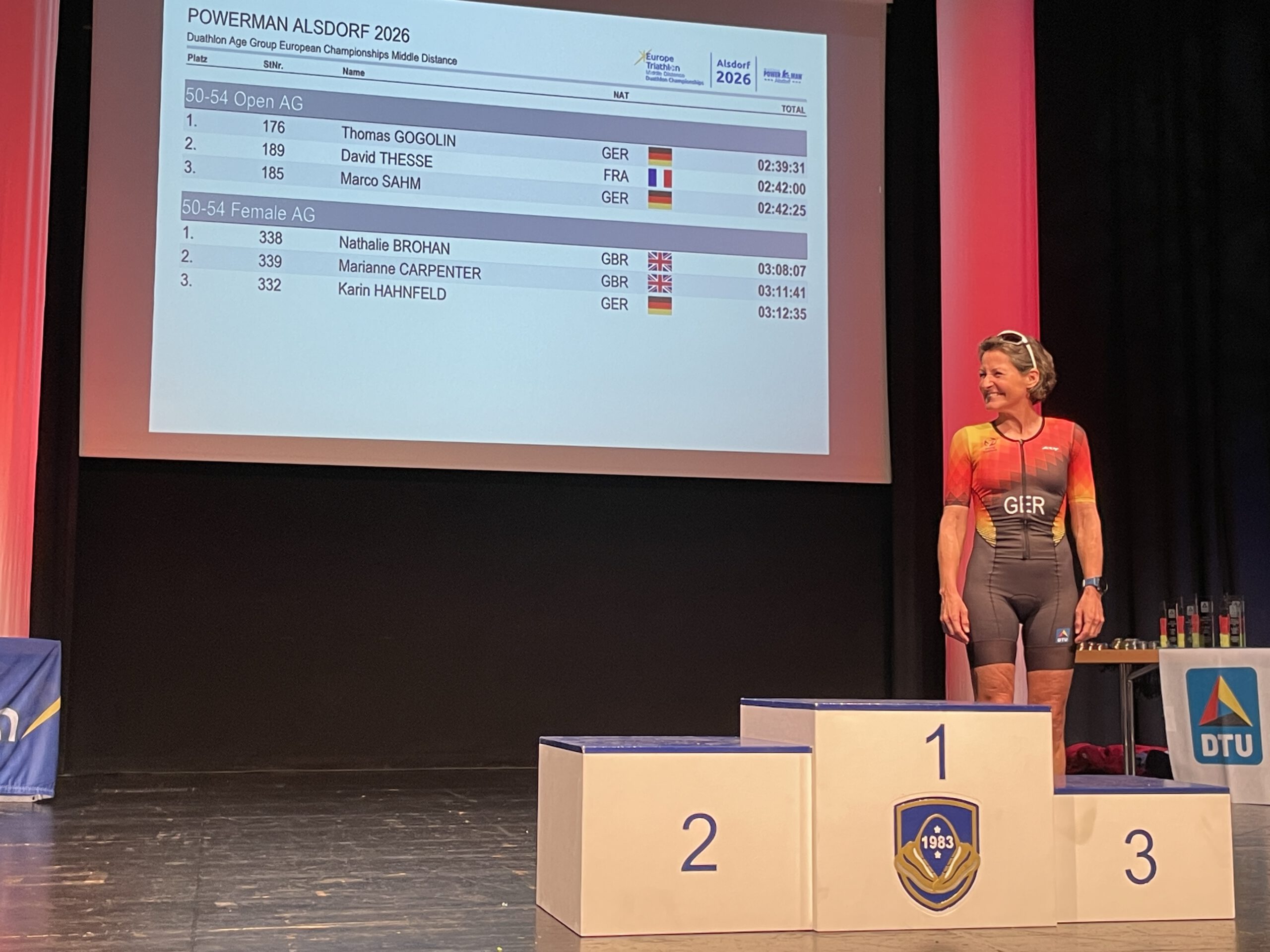 Karin Hahnfeld: Teilnahme an Europameisterschaft, Deutsche Meisterschaft inbegriffen – Karin zog alle Register bei ihrem ersten größeren Duathlon, bewies wieder einmal ihre Laufstärke und kam auf Platz 3 bei den Europameisterschaften und darüber hinaus auf Platz 1 bei den Deutschen Meisterschaften in ihrer Altersklasse mit einer herausragenden Zielzeit von 03:12:35.